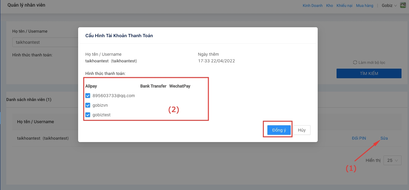 Bước 2: Chọn vào sửa (1) => Chọn tài khoản thanh toán tương ứng (2) => Đồng ý (3).