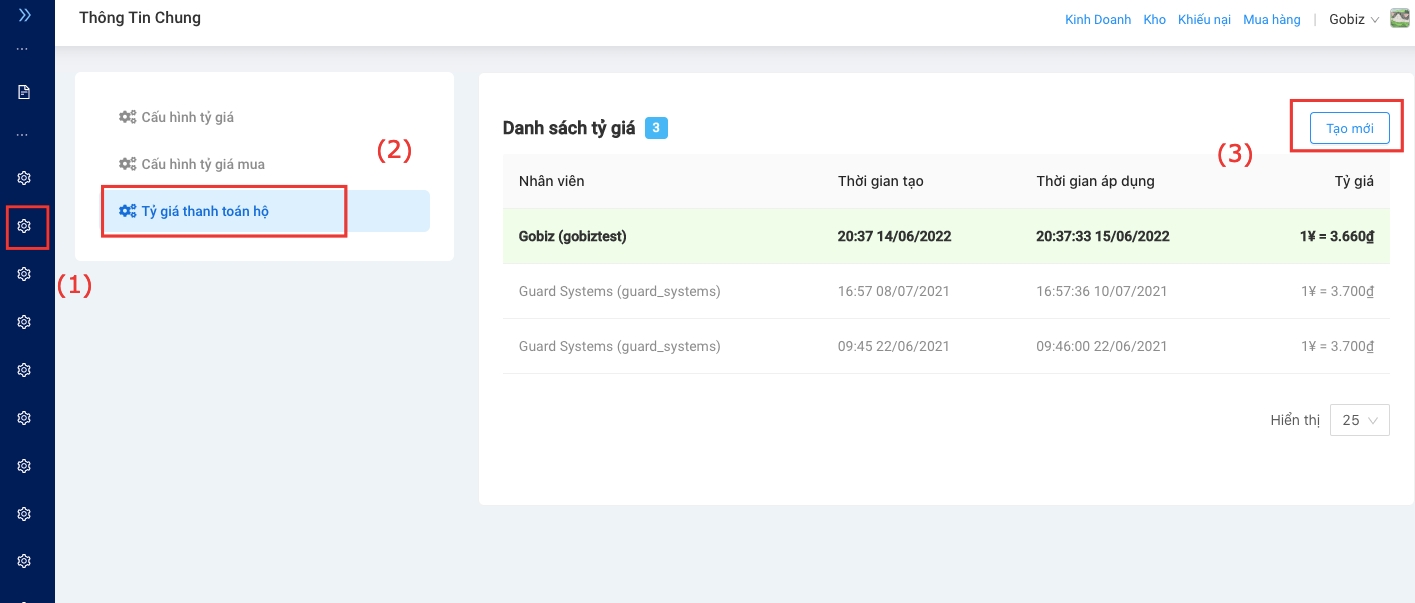 Bước 1: Menu => Cấu hình tỷ giá (1) => Tỷ giá thanh toán hộ (2) => Tạo mới (3)