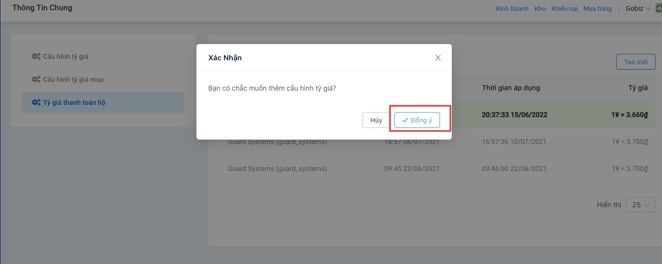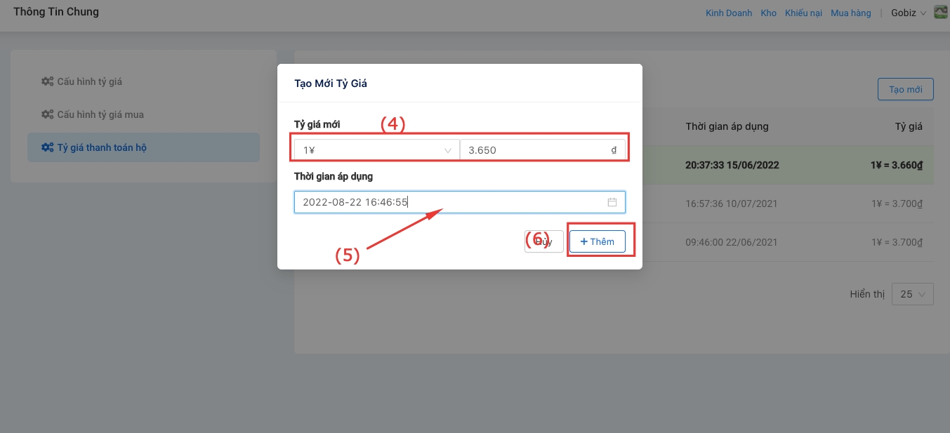 Bước 2: Điền tỷ giá mới (4) => Chọn thời gian áp dụng (5) => Thêm (6) => Bấm xác nhận đồng ý.
