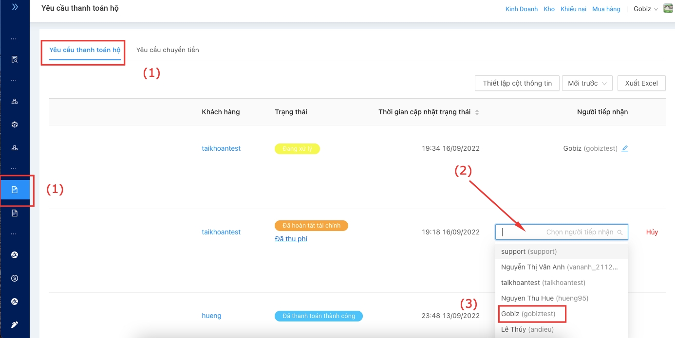Bước 2: Tại cột Người tiếp nhận, Chọn user/nhân viên tiếp nhận (2) => Bấm chọn vào user nhân viên chỉ định việc xử lý YCTT (3) _ (*Lưu ý: bấm chọn vào phần tên tài khoản màu đậm hơn bên trái)_