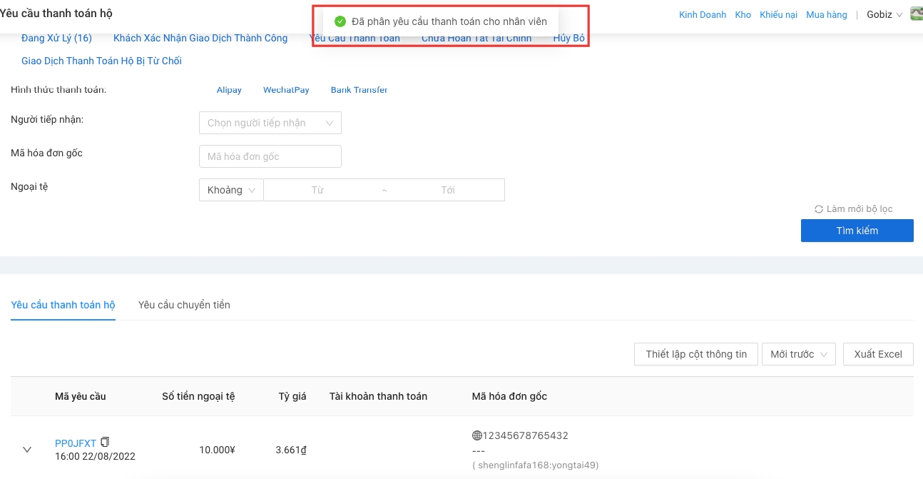 Bước 1: Vào Menu => Chọn yêu cầu thanh toán (1) => Tại mục Yêu cầu thanh toán, chọn mã YCTT đang chờ xử lý để phân đơn