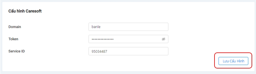 Quý khách có thể điền thông tin domain, token, service ID của đơn vị chăm sóc khách hàng của mình, sau đó ấn Lưu cấu hình.