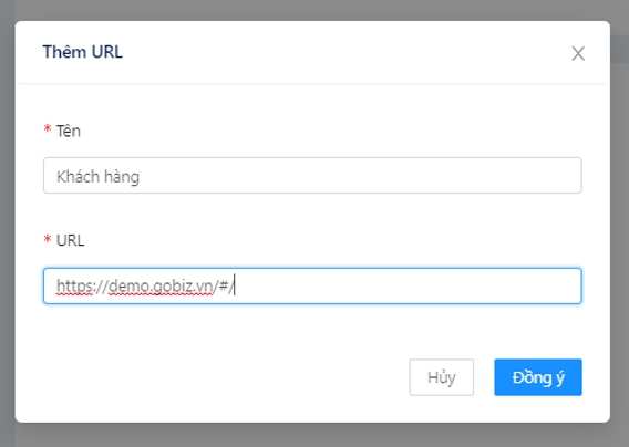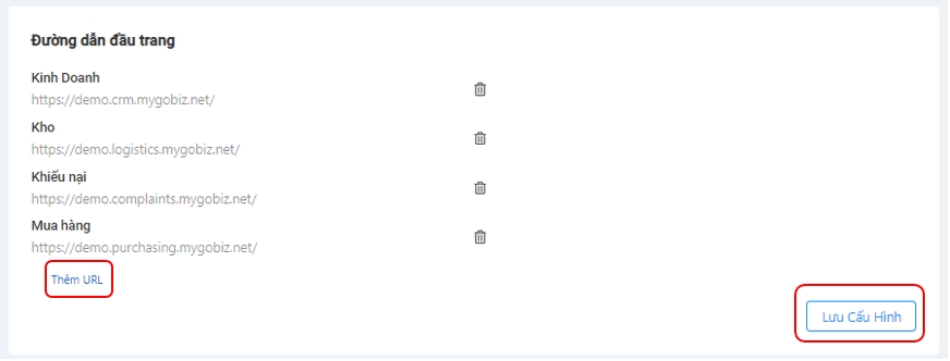 Trong mục đường dẫn đầu trang, quý khách ấn vào thêm URL để điền tên và link URL của phòng ban phụ trách và ấn lưu cấu hình