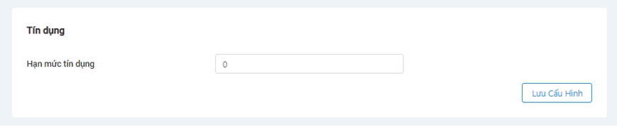 Trong mục tín dụng, nếu muốn áp dụng mức tín dụng cho khách hàng, bạn điền số tiền muốn áp dụng vào hạn mức tín dụng và ấn lưu cấu hình