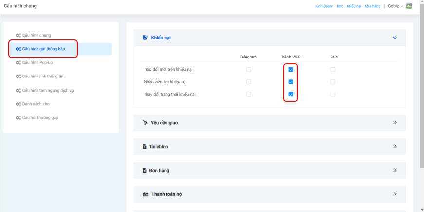 Đây là khu vực để bạn thiết lập chức năng gửi thông báo cho các tác vụ như: Khiếu nại, yêu cầu giao, tài chính, đơn hàng, thanh toán hộ, thông tin cá nhân, đăng ký gửi.