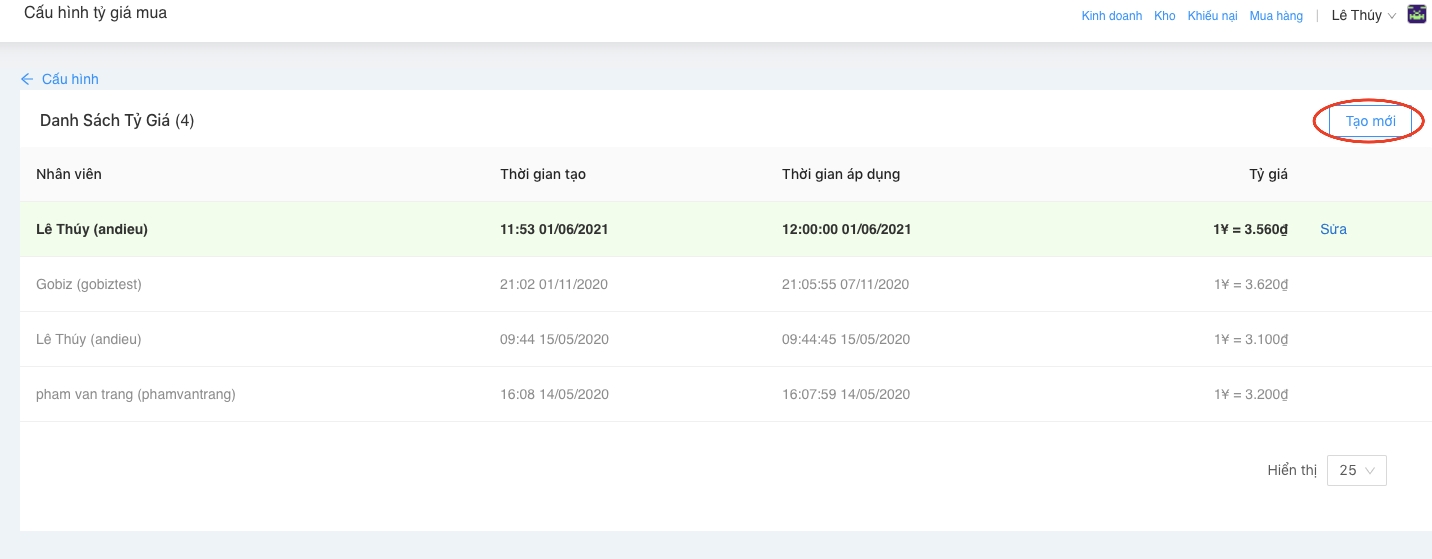 Hệ thống sẽ hiển thị danh sách các cấu hình tỷ giá bao gồm các thông tin: