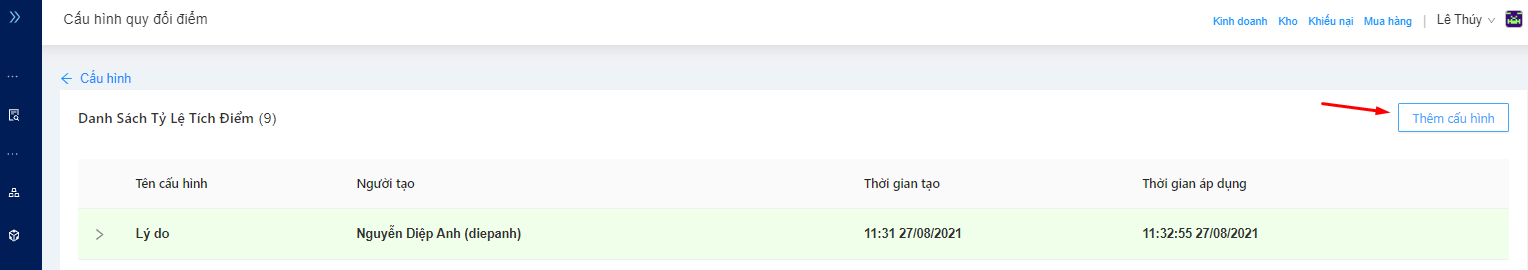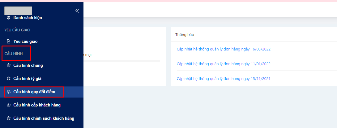 Tại menu Quý khách chọn Cấu hình => Chọn Cấu hình quy đổi điểm