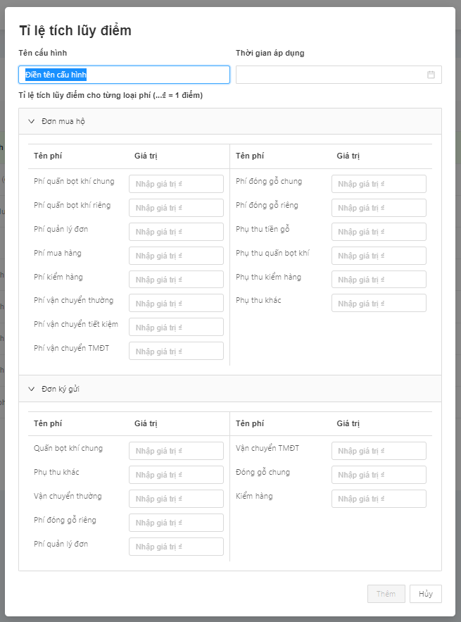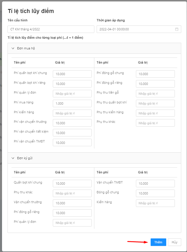 Hiện tại hệ thống đang cấu hình tỉ lệ tích lũy điểm cho từng loại phí dịch vụ theo công thức quy đổi: ….. VND = 1 điểm (ví dụ: 1000 VND = 1 điểm)