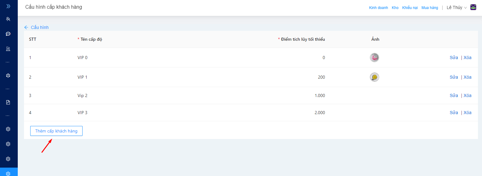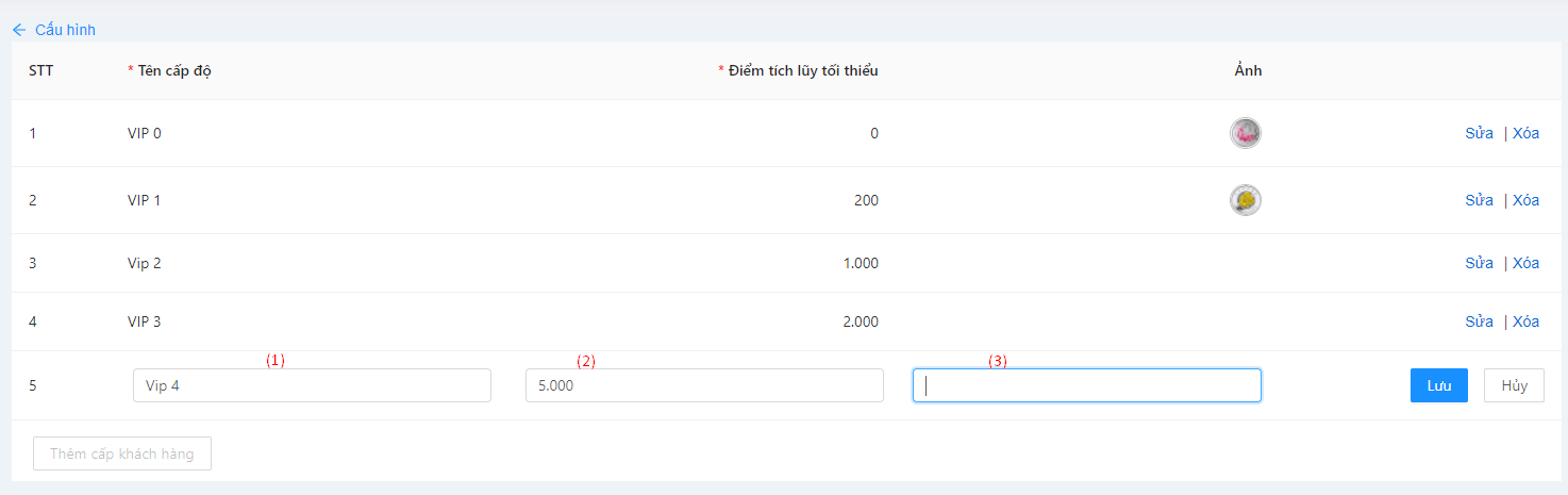 Khi cấu hình cấp độ chỉ nhập 1 mức điểm tối thiểu, cho phép nhập cả âm cả dương (Ví dụ: 1000 điểm = VIP 1)