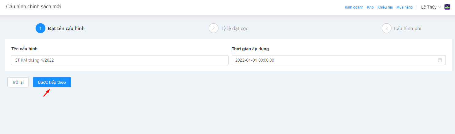 Điền tên cấu hình (tên chương trình khuyến mãi) và thời gian áp dụng chương trình, hoàn tất Quý khách ấn sang Bước tiếp theo