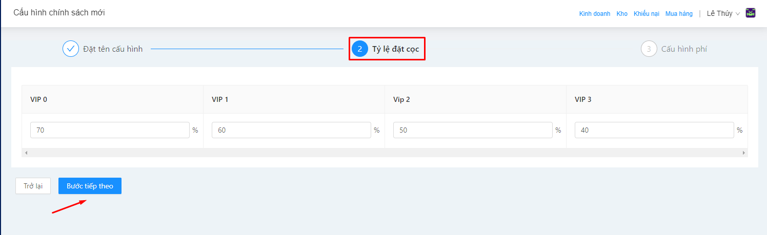 Quý khách cấu hình tỷ lệ đặt cọc cho từng cấp khách hàng.