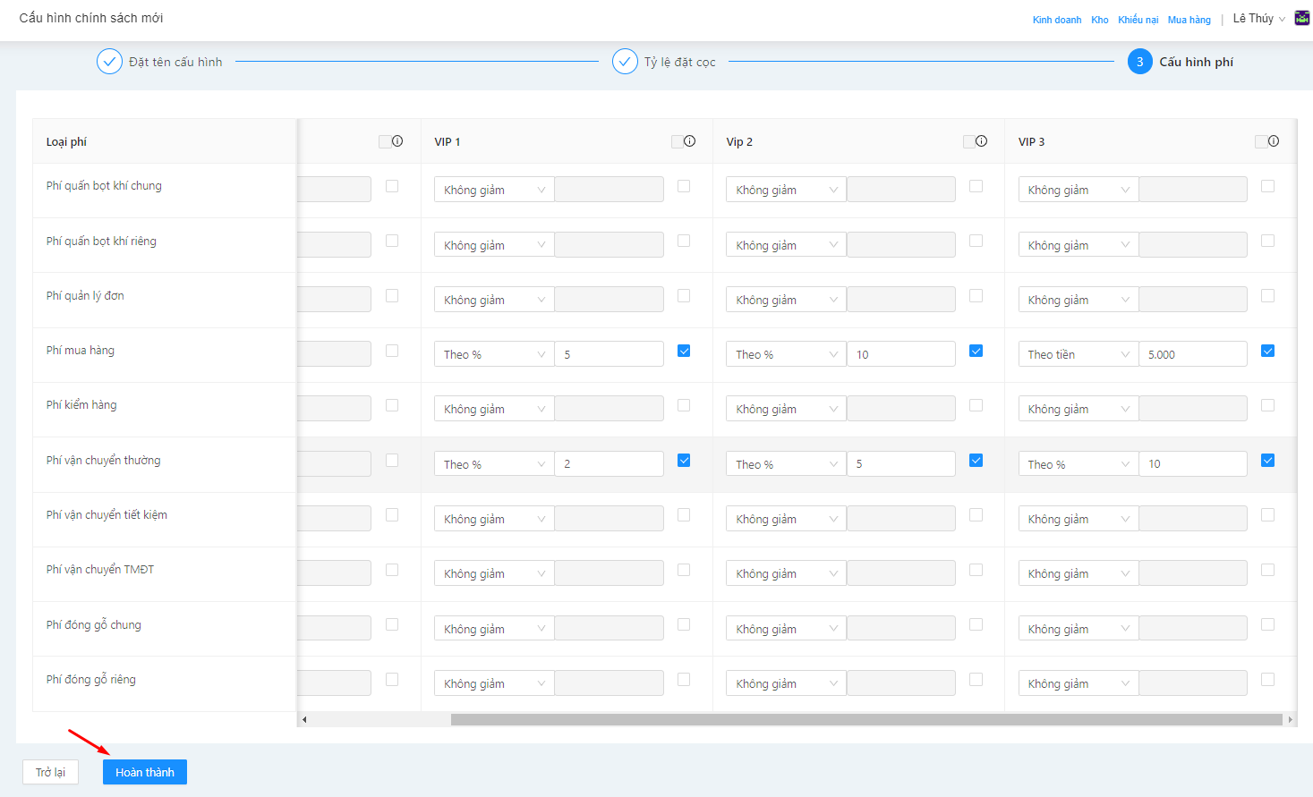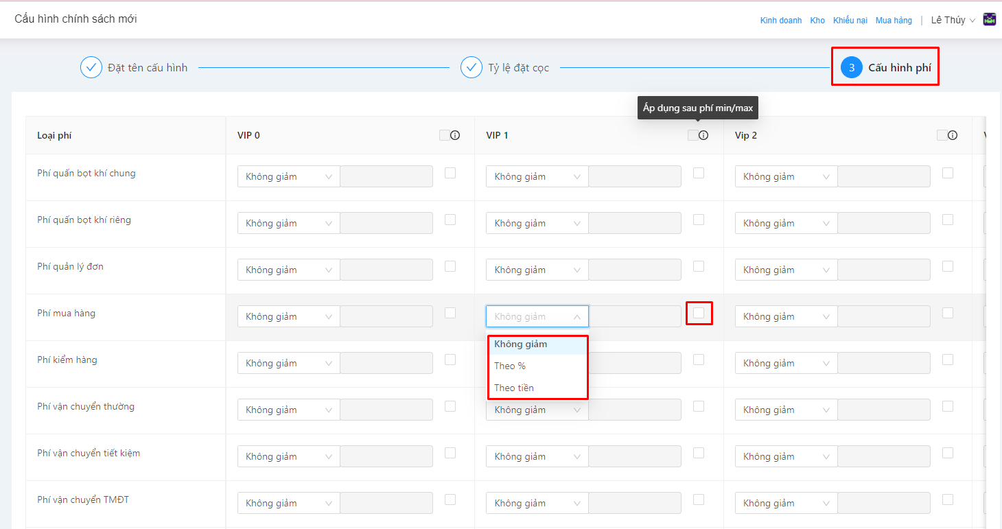 Bước 3: Cấu hình phí tương ứng cho cấp khách hàng