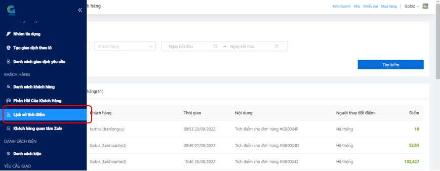 Để xem điểm tích lũy của khách hàng, từ thanh tác vụ, quý khách chọn khách hàng => lịch sử tích điểm