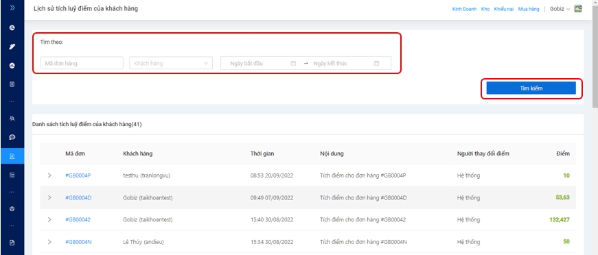 Tại giao diện chính, quý khách có thể tìm kiếm số điểm tích lũy theo mã đơn hàng hoặc mã khách hàng rồi ấn Tìm kiếm