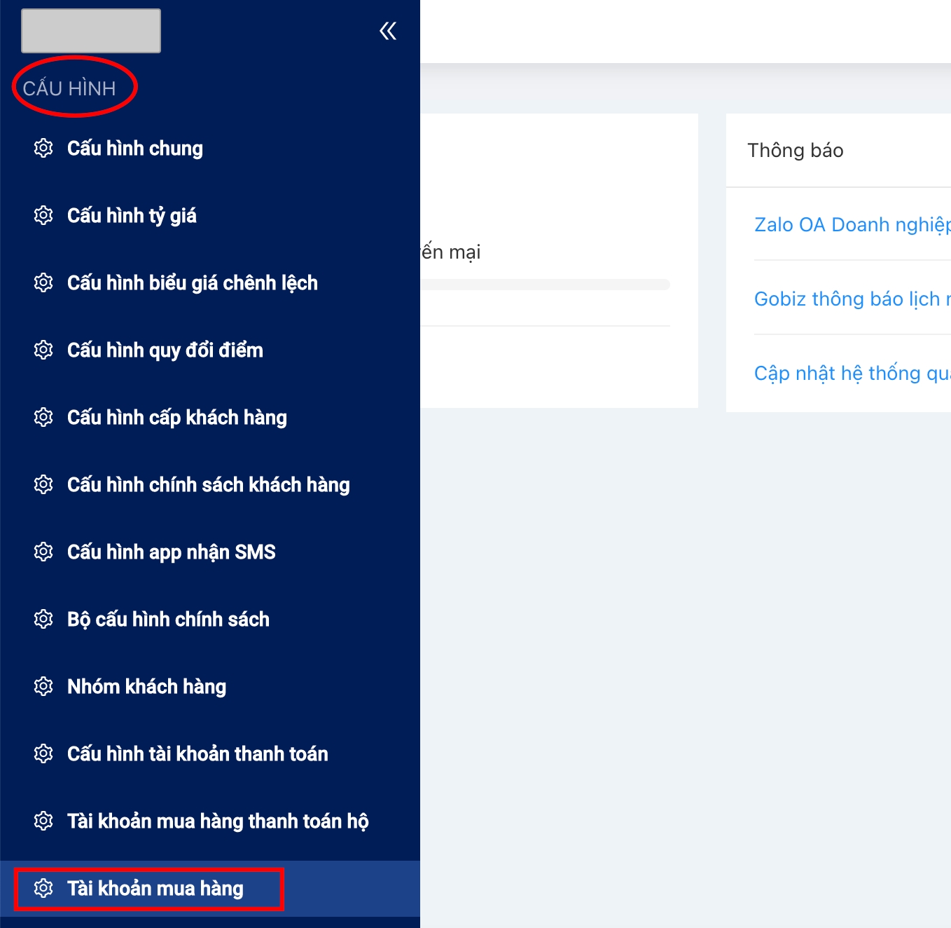 Truy cập Menu => Chọn menu Cấu hình => Chọn Tài khoản mua hàng