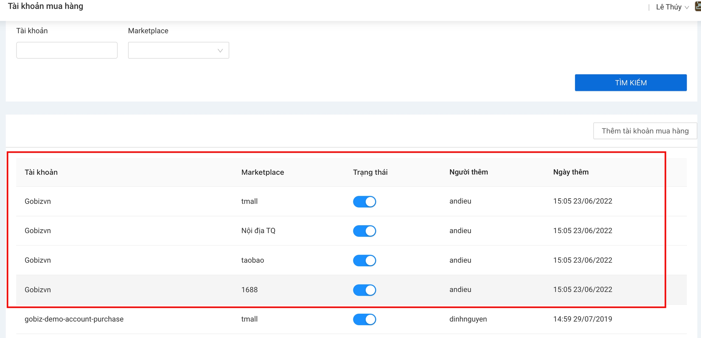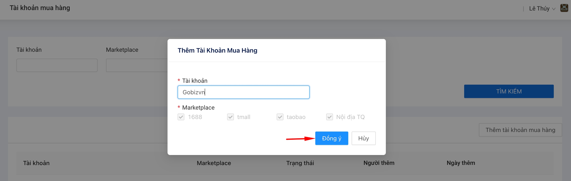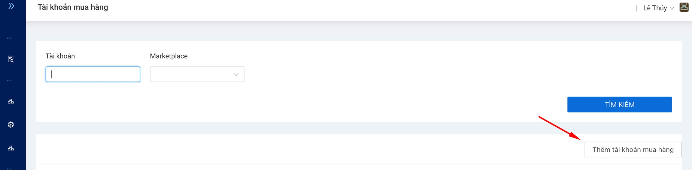Click vào button Thêm tài khoản mua hàng