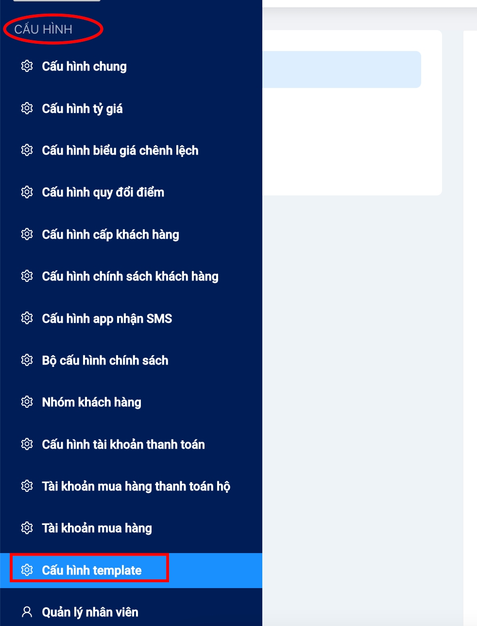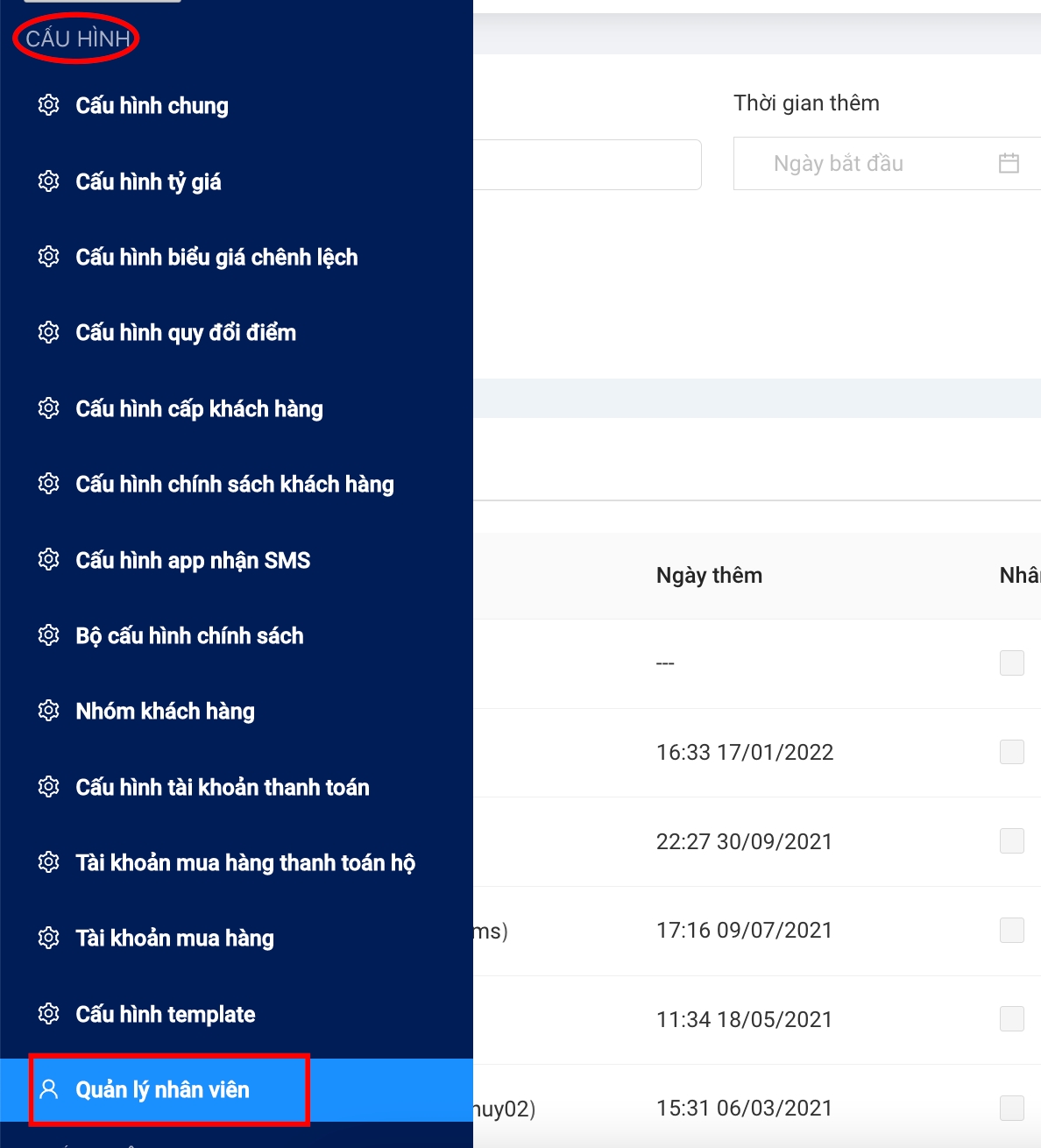 Truy cập Menu => Chọn menu Cấu hình => Chọn Quản lý nhân viên