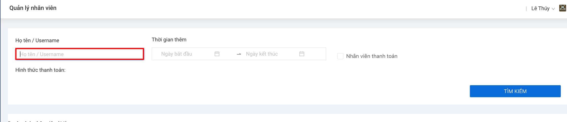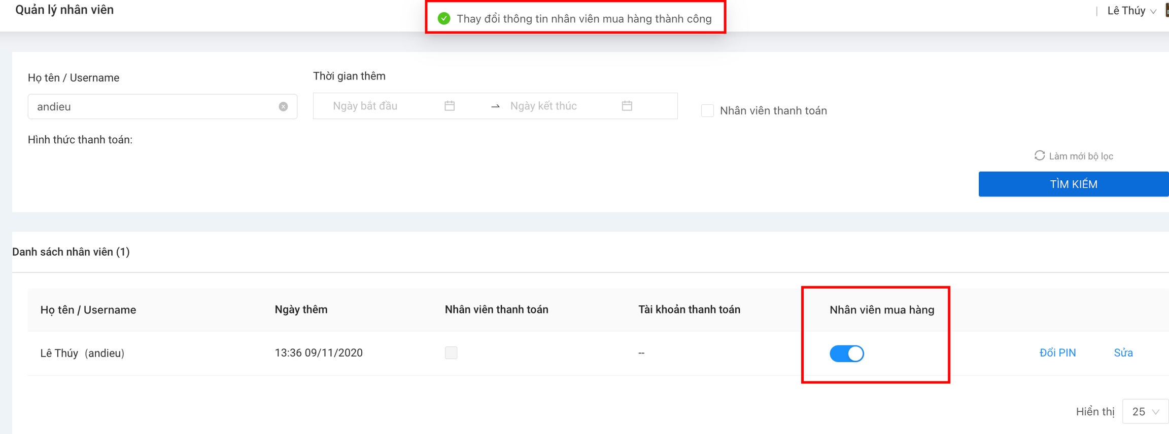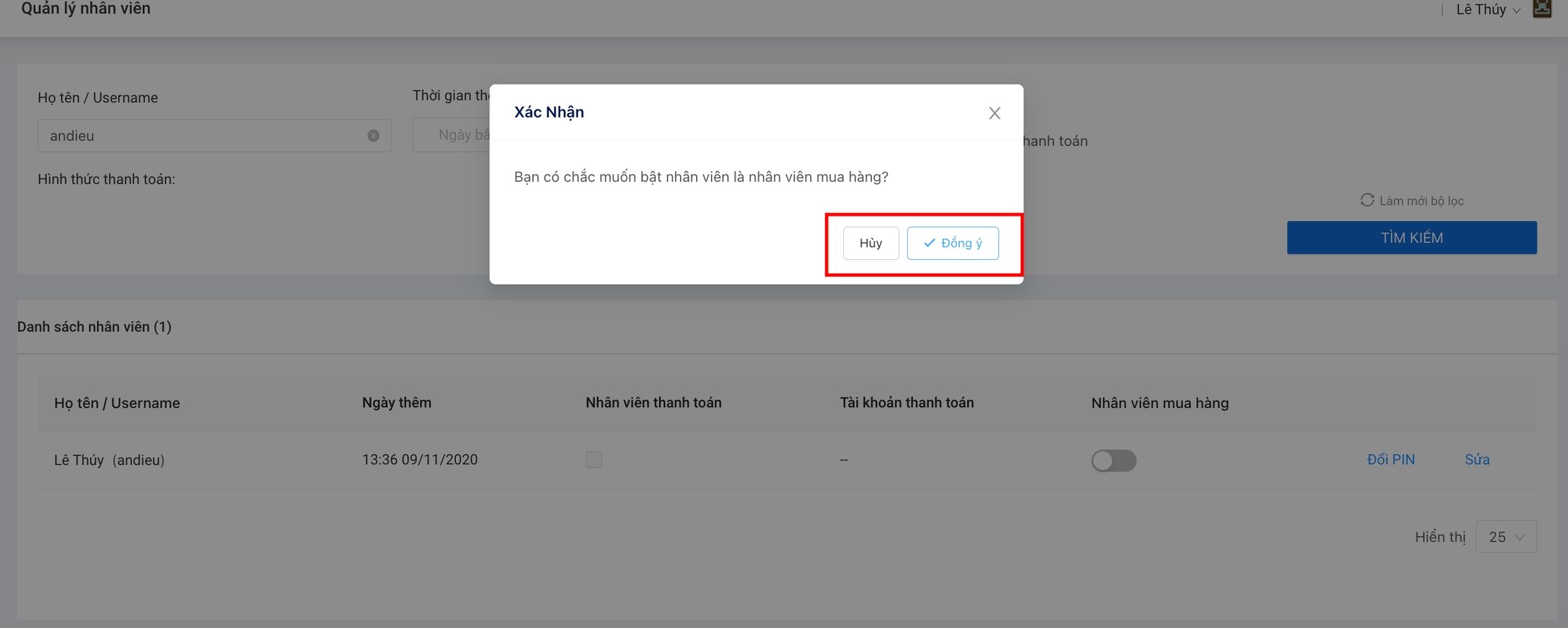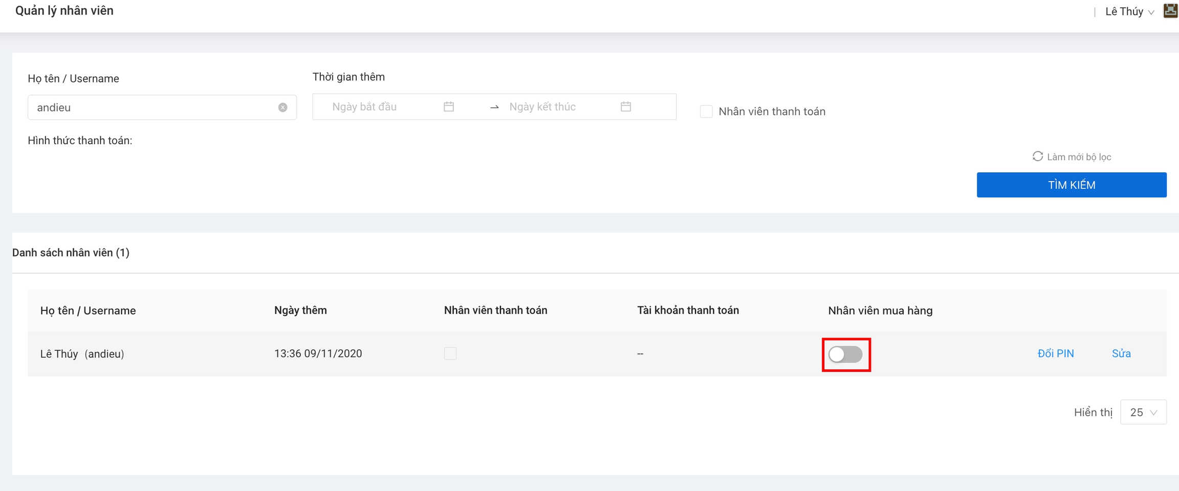 Quý khách tiến hành tìm kiếm nhân viên mua hàng trong danh sách bằng cách gõ tên username hoặc tìm theo họ & tên.